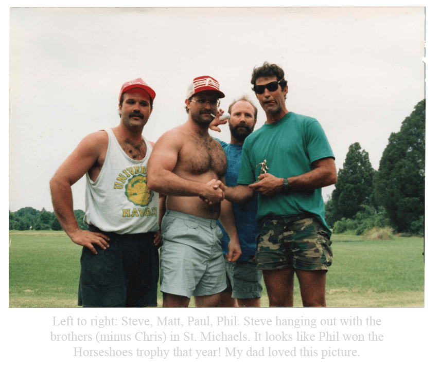 My dad’s parents eventually retired to St. Michaels on the Eastern Shore of Maryland and he loved to visit them. He would help around the house and in the yard and would relax playing golf and games of horseshoes with his brothers. Steve frequently brought my mom and I to visit his parents and loved playing whiffle ball with me and his nieces and nephews. My dad’s father Charley died on March 19, 2003, the day after his 80th birthday, from cancer-related complications. My grandmother, Regina, my dad, and my dad’s siblings were crushed by Charley’s passing. Charley was buried in Arlington National Cemetery and my dad would bring us to visit the grave at least once a year, usually on Memorial Day. Regina passed away a few years later at the age of 79 on May 24, 2007 and was buried with Charley in Arlington. To compound the grief the siblings felt after losing their parents, my dad’s sister, Ellen, died December 24, 2009 after battling a brain tumor for over 15 years, leaving behind a daughter, Lauren, and a son, Morgan. Losing their parents and sister in a relatively short period of time hit my dad and his brothers hard and each struggled with it in their own way.