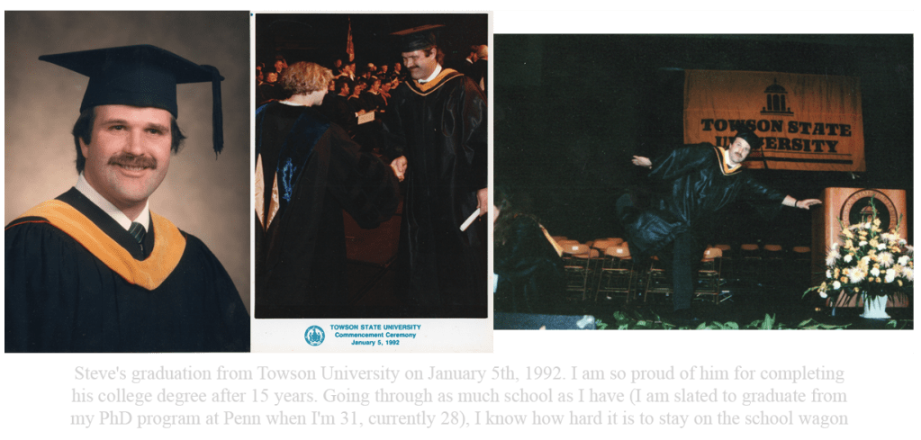 Working full-time at Rosewood slowed his college progress to a crawl but he stayed the course and graduated with a Bachelor of Science degree in psychology in ’92, 15 years after starting at Towson. My dad was proud of graduating from college and constantly joked about how long it took him to get that degree. I was born later that same year and my dad named me Eric, after Eric Clapton. He was incredibly proud and happy to be a father. While attending Towson and working at Rosewood, Steve lived in and around the Baltimore/Towson area, but soon after my parents got married, they bought their first house in the northeast Baltimore city neighborhood of Hamilton. We eventually moved to Towson in 2007, just before I started high school.